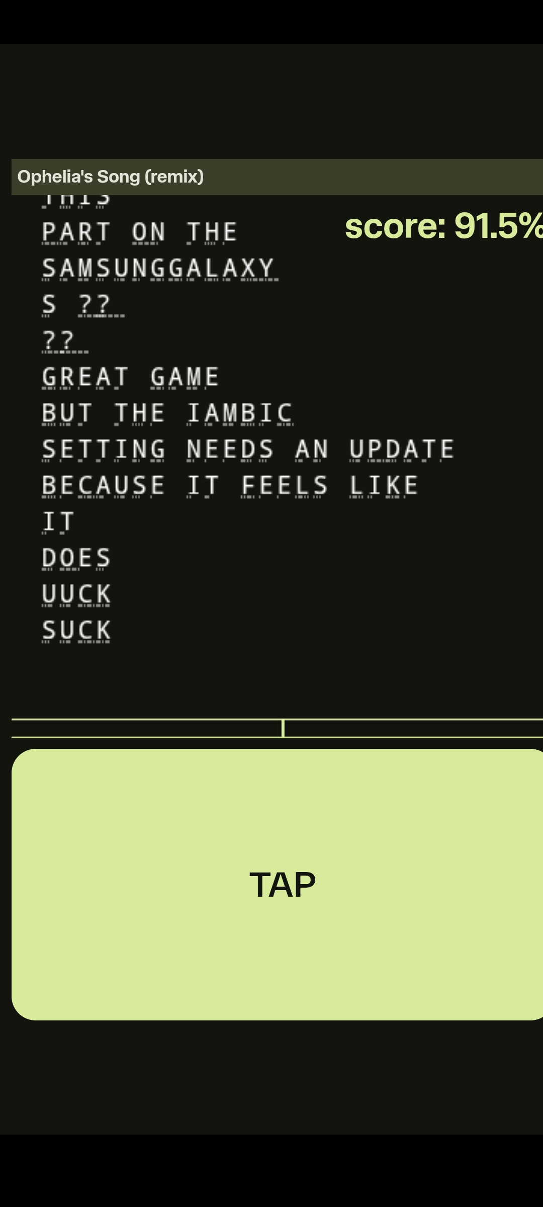 It’s very unpolished (only two songs, no end screen) but hopefully demonstrates the game mechanics.
